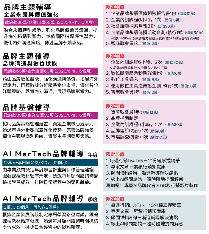 ※ 專案總經費至少60萬元,政府經費最高不超過30萬元- 品牌主題輔導 (品牌數位賦能)