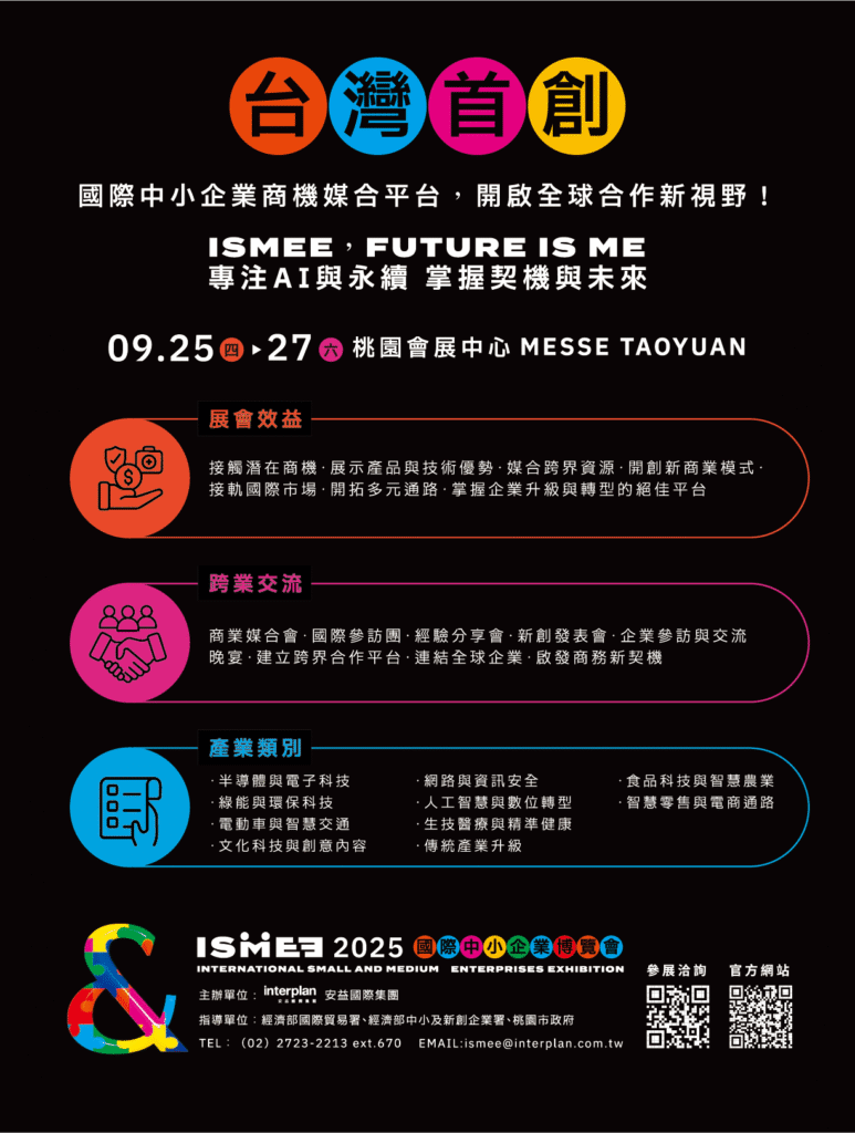 「ISMEE 2025 國際中小企業博覽會」將於2025年9月25日至27日在桃園會展中心舉辦,以「專注AI與永續 掌握契機與未來」為主題,聚焦「跨產業媒合」、「開拓國際市場」和「商務解決方案」三大效益營造,由ISMEE為參展企業提供全方位支持。